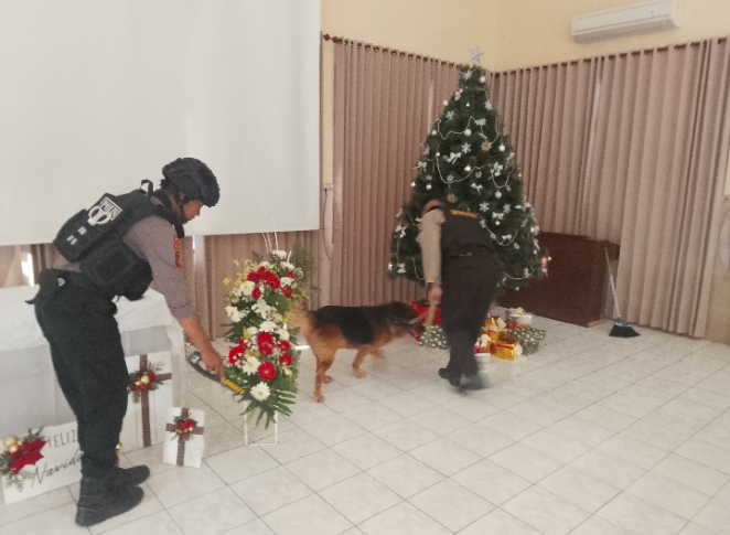 Sterilisasi Gereja dilakukan oleh Tim Satuan Samapta dengan melibatkan anjing pelacak milik Unit K9 Polres Jombang.